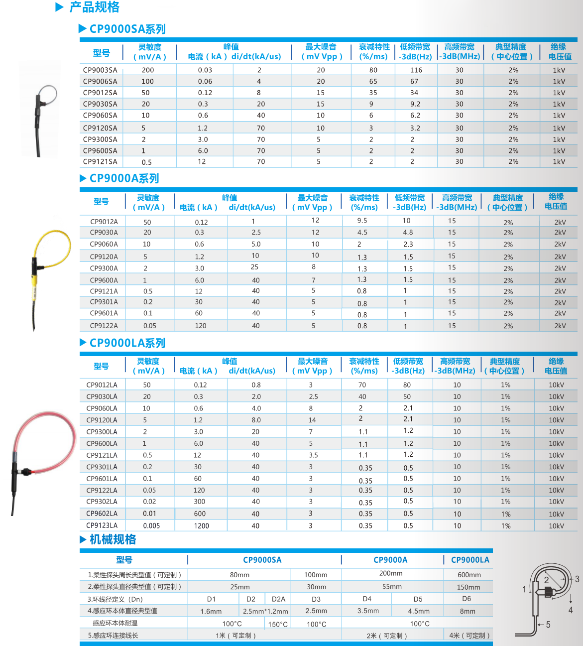 5、CP9000SA系列探头感应环细小柔软,线径典型值2.5mm、2.5mm*1.2mm